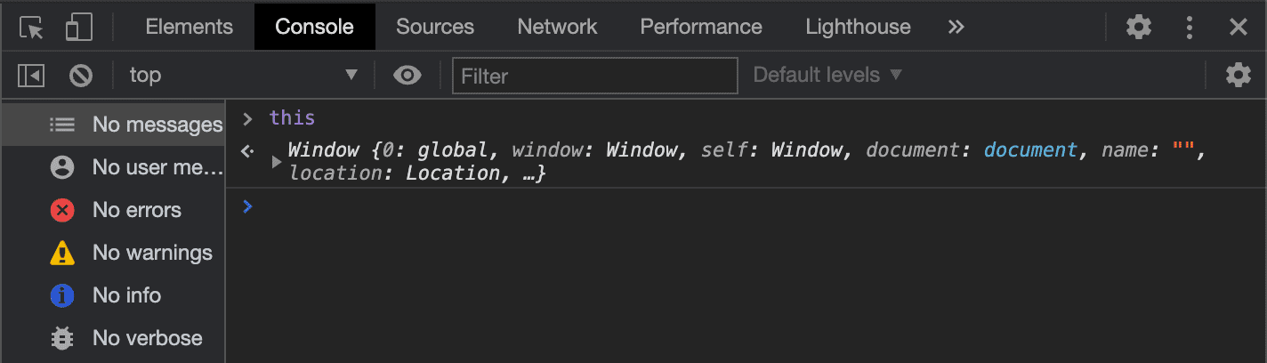 While it may seem deceivingly simple, the this keyword is not like other keywords in JavaScript. It is completely determined on where it is called. For example, in the code below, we have used this not in a function, but simply within a bare HTML script tag.